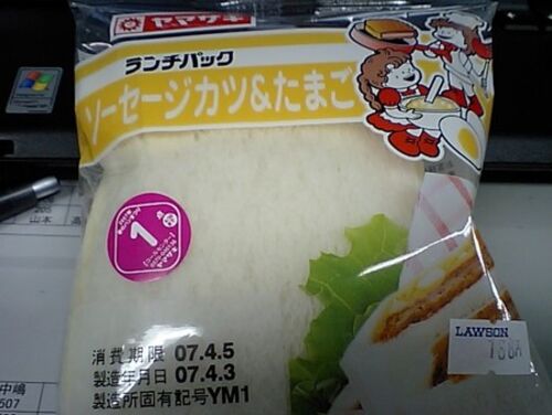 ごぶさたでランチパックです。なにせ福岡でランチパックの新作を見つけられなかったので だいぶショックでした。・ソーセージカツ&たまご 日時:4/3 2007 地域:東京港区 店舗:ローソン 評価:★★ ハムカツサンドイッチのイメージです。それに たまごサンド…
